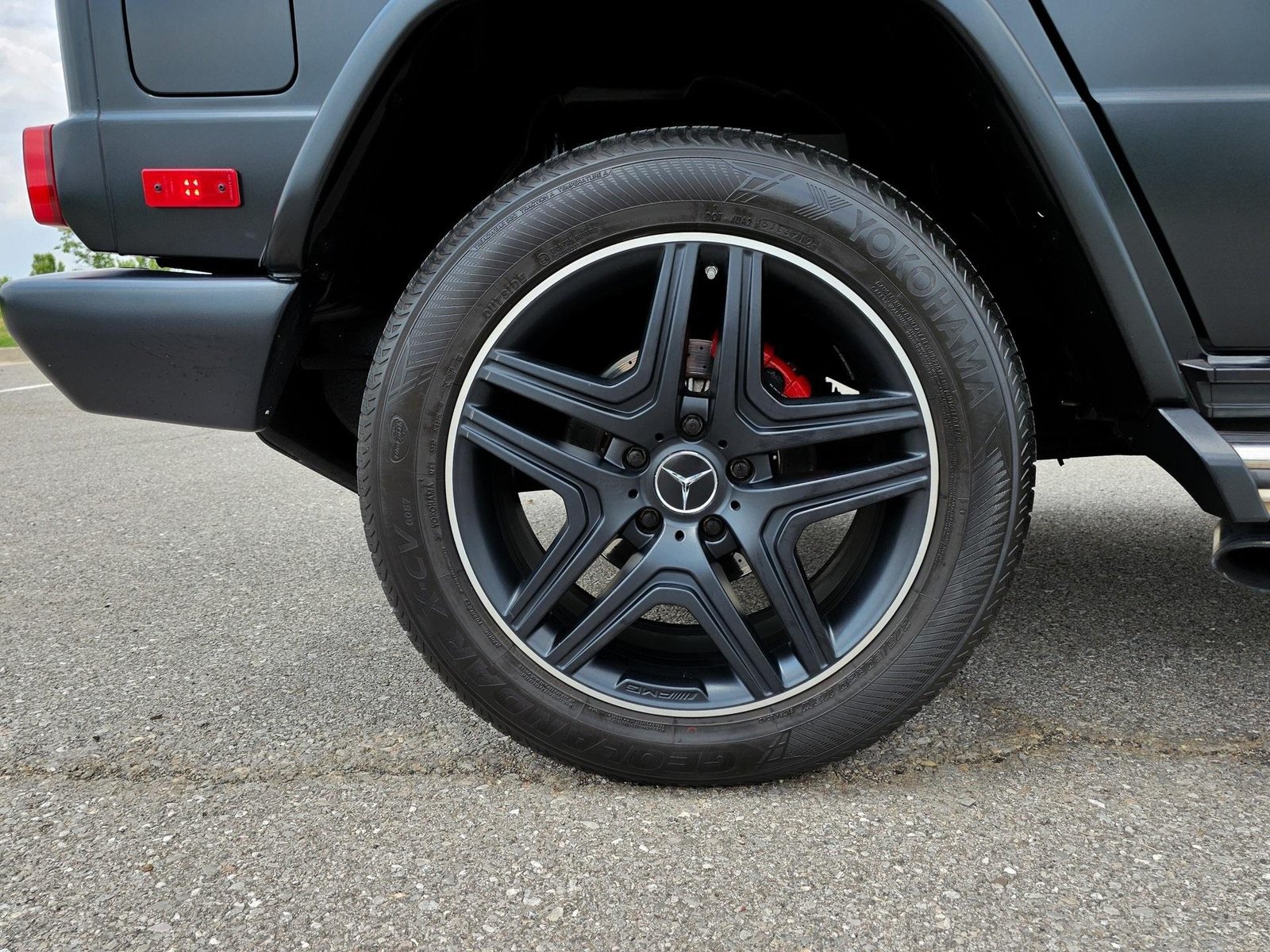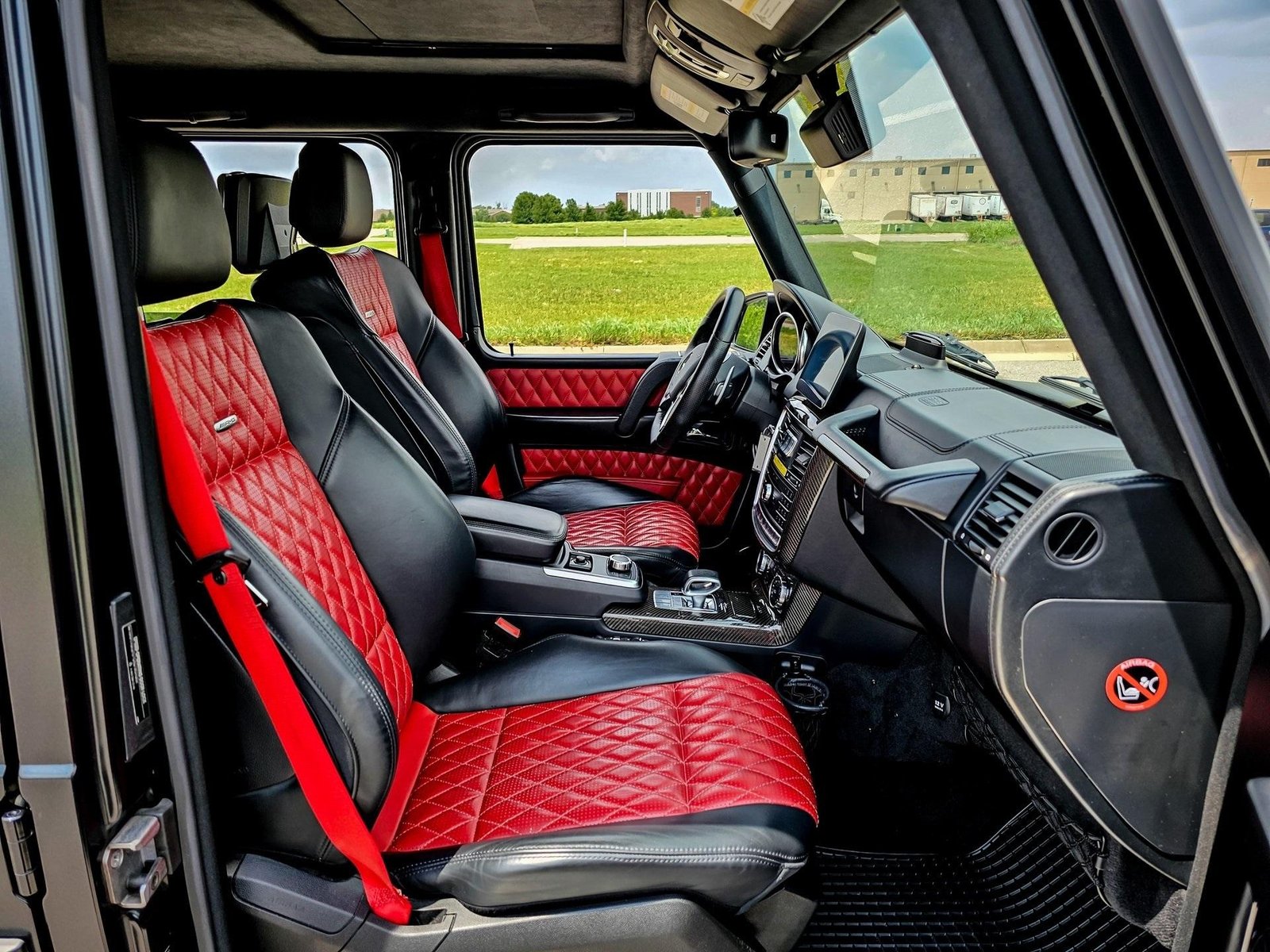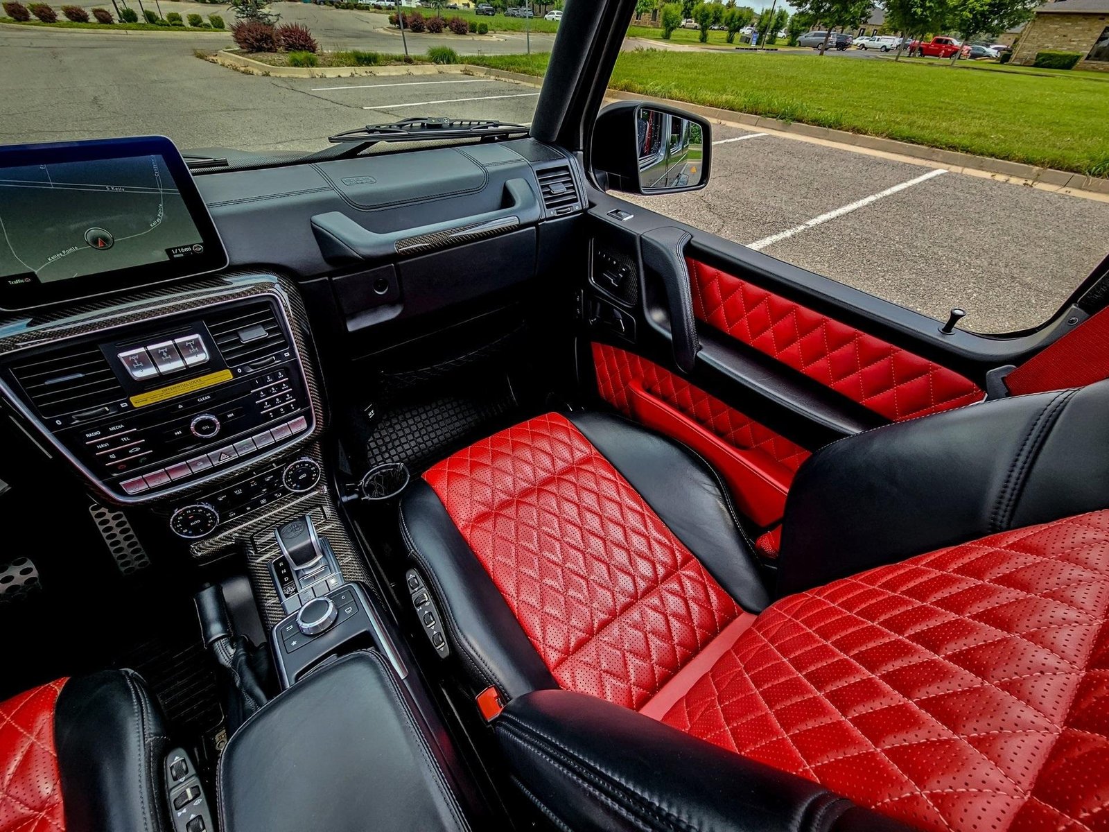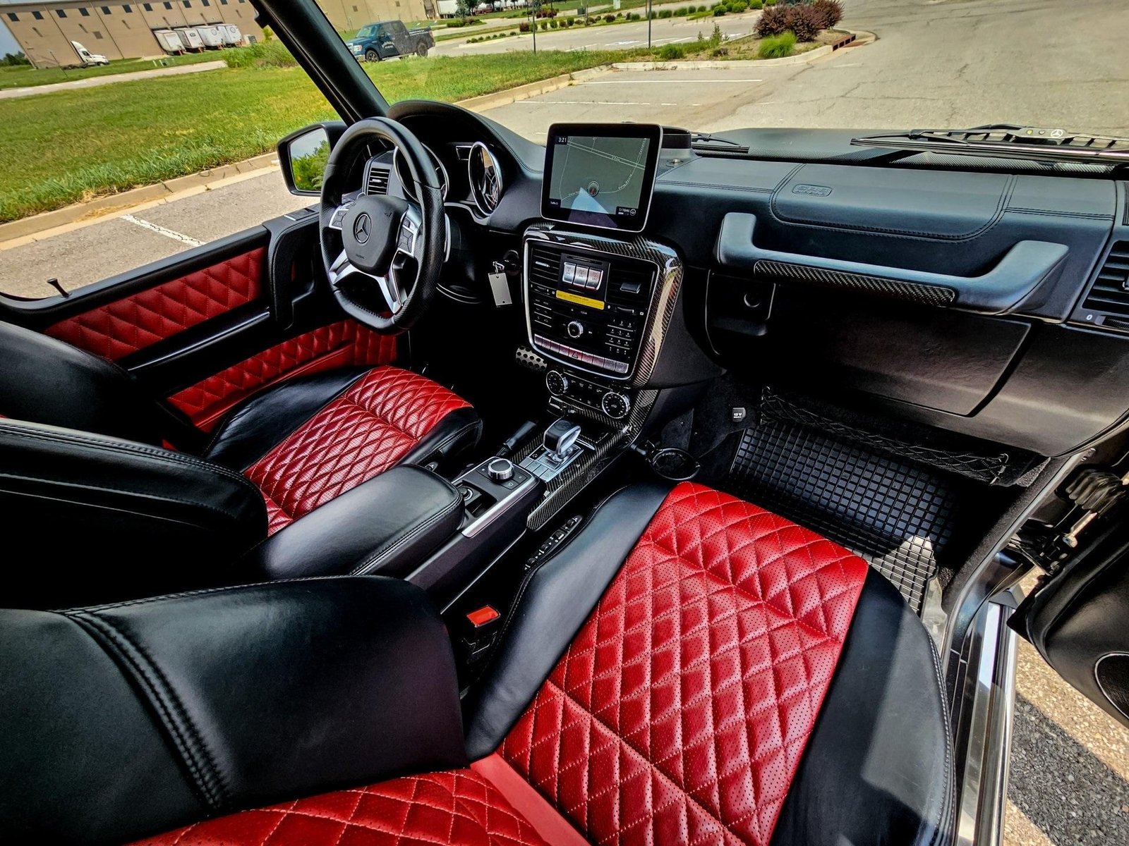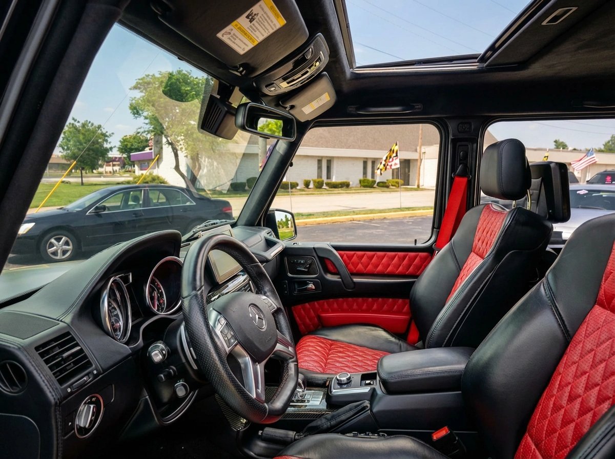 The exterior showcases the timeless, boxy G-Class design with a bold and commanding presence, enhanced by the AMG styling package, 20” AMG twin 5-spoke black wheels, red brake calipers, and aggressive stance that defines the iconic G-Wagon identity.