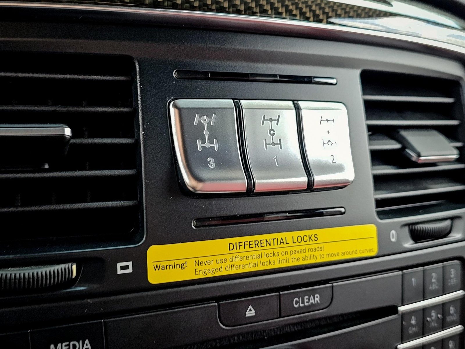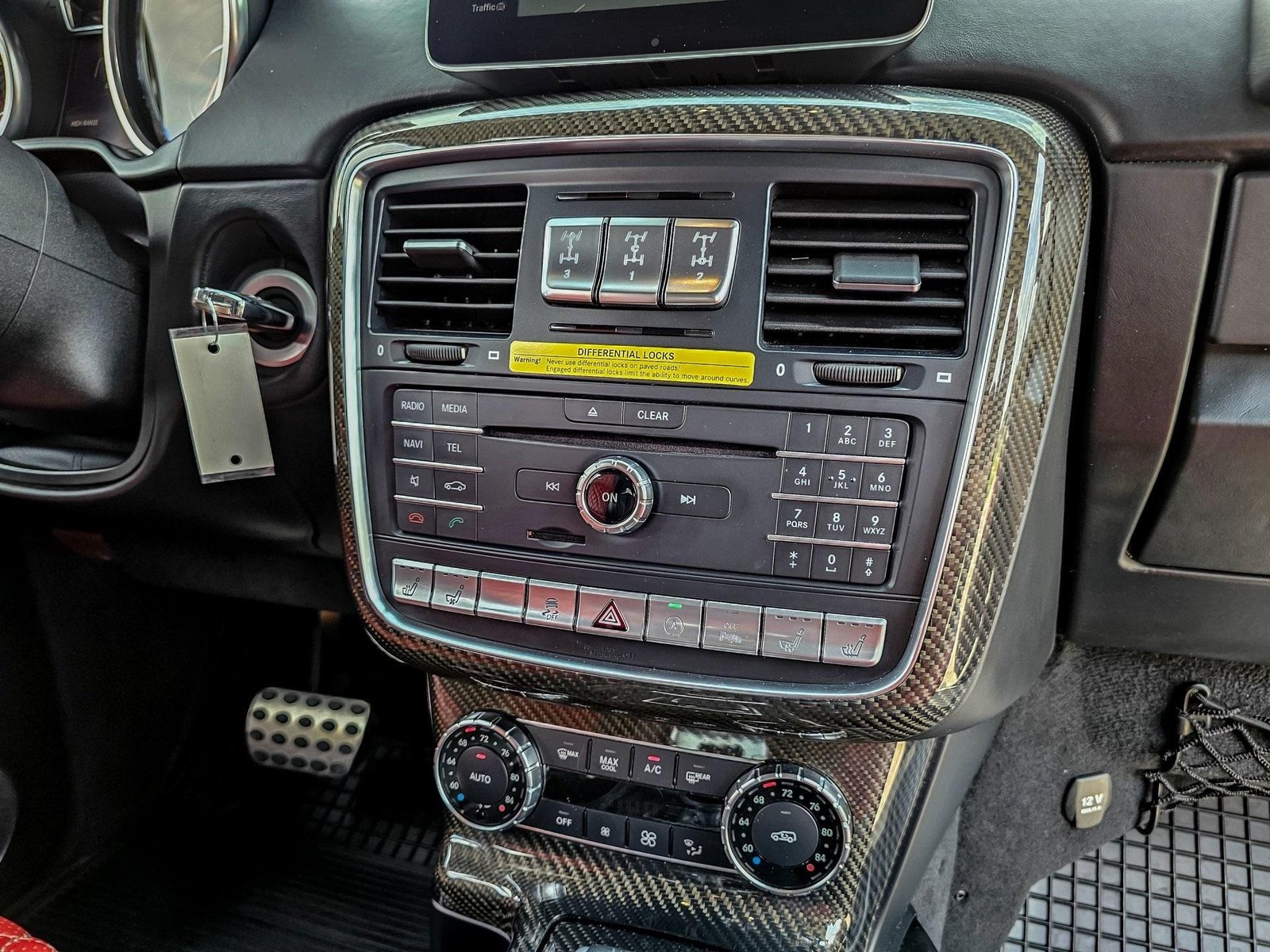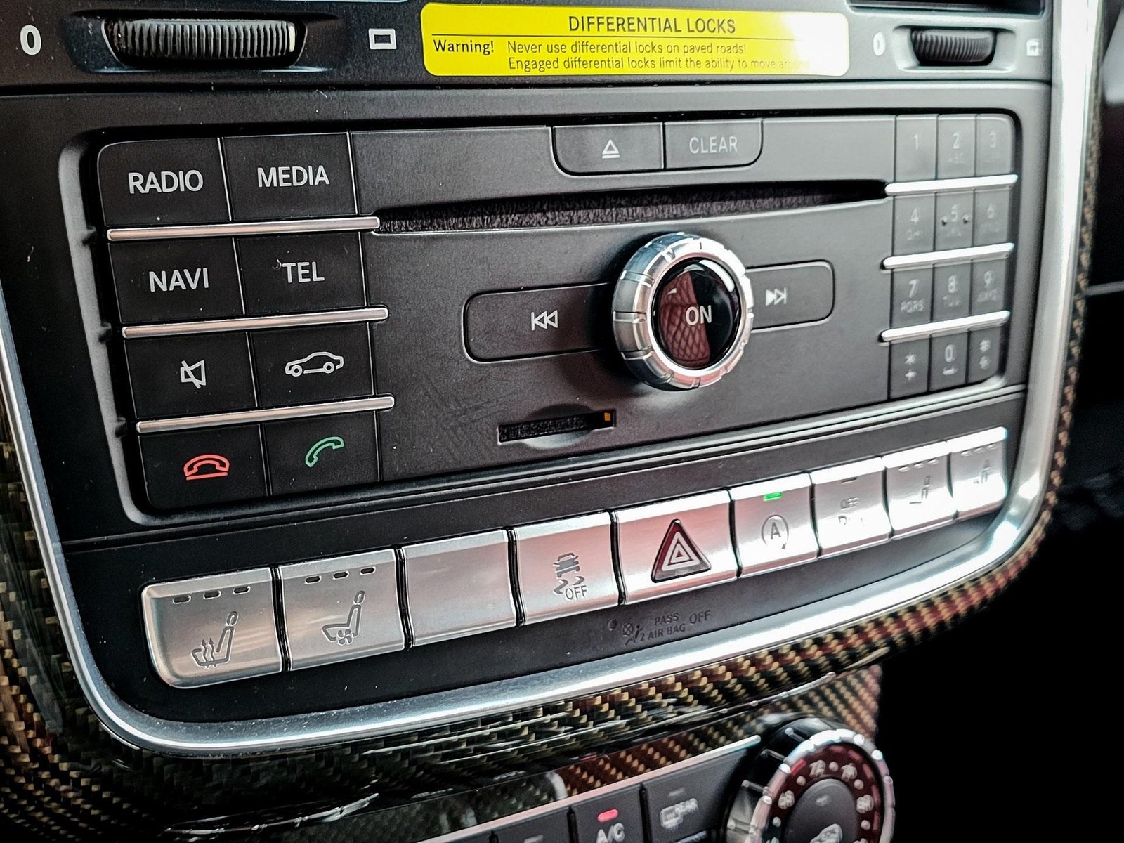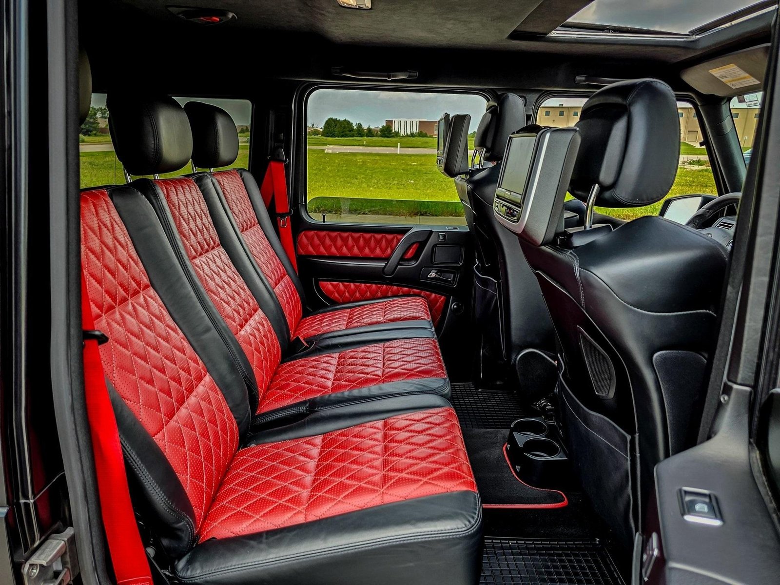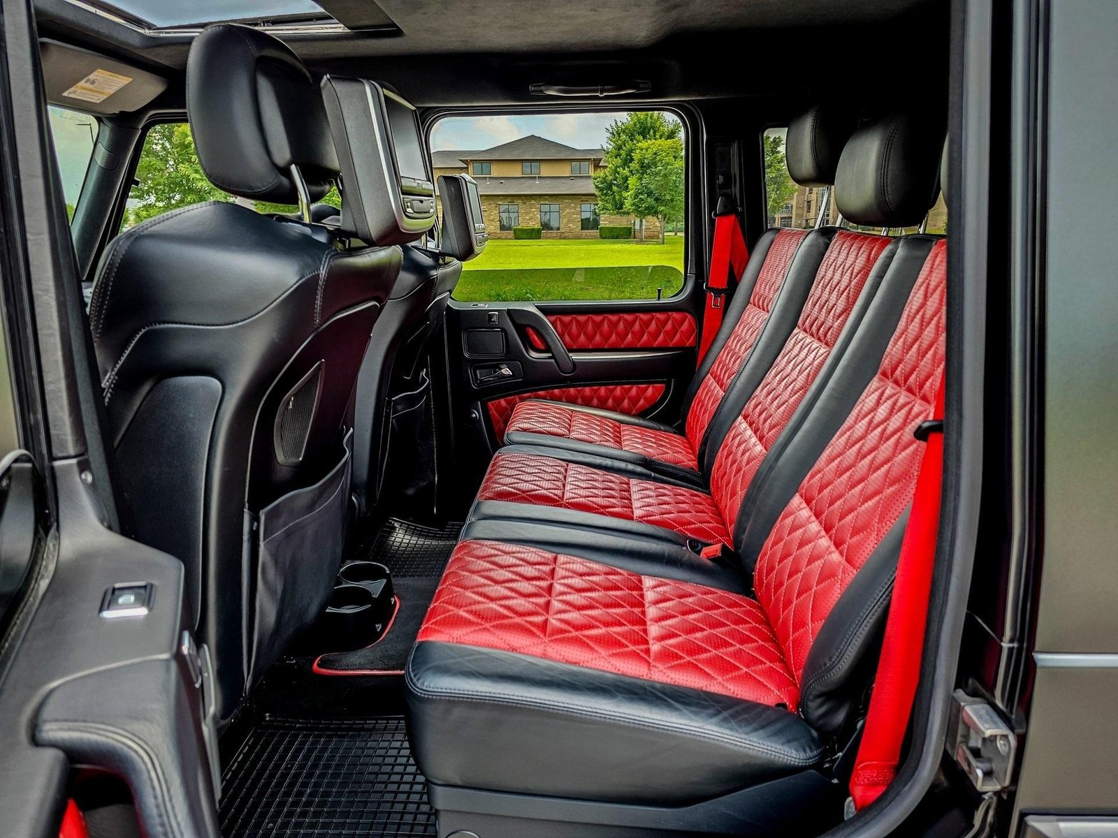 Technology and comfort features include COMAND navigation system, Harman Kardon premium audio system, dual rear entertainment screens, Bluetooth connectivity, and garage door opener integration, delivering modern convenience within a classic off-road platform.